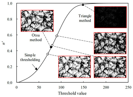 In this study, image thresholding was used to distinguish between the soil solid and the void. Three thresholding methods were used to threshold the soil images: simple thresholding, the Otsu method, and the Triangle method. The Otsu method and the Triangle method are representative automatic thresholding methods. The Otsu method is a famous automatic thresholding method that returns a single threshold value determined by minimizing the intraclass intensity variance, or equivalently, by maximizing the interclass variance [42]. The Triangle method is an algorithm for finding the end of an image histogram and it determines the threshold value by normalizing the height and dynamic range of the histogram [43].