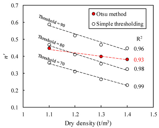 As the threshold value increased, increased from 0 to 1. This is the same as the possible range of values as shown in Figure 1. is almost close to 1 for threshold values of 170 and above. This is because the pixel intensity of a grayscale image is mostly below 170, as shown in Figure 4g. If the threshold value is the same, the result of the thresholding is the same. The threshold values determined by the Otsu method and the Triangle method were 78 and 149, respectively. So, the calculated from the binary images obtained by the Otsu method and the Triangle method showed the same value as the result of performing simple thresholding at the threshold values 78 and 149. Therefore, the thresholding results in Figure 4 all exist on the curve in Figure 5. Because the value of is determined by the threshold value, it is necessary to verify whether has a correlation with under various threshold values. According to the thresholding method, the result of the extracted from the same soil image was different, indicating that it is essential to determine an appropriate thresholding method for evaluating soil voids.