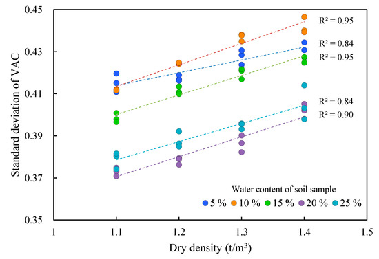 where is the standard deviation of VAC, is at the threshold value = i, is the mean value of , and is the sample size. The relationship between the standard deviation of VAC and the for soil SiL under various water content conditions is shown in Figure 8.