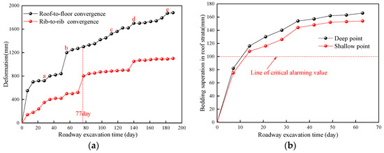 The results of the monitoring of the separation layer of the roof are presented in Figure 5b. The shallow point has a maximum separation value of 155 mm, while the deep point has a maximum separation value of 167 mm. It takes 14 days for the roof separation value to exceed the critical threshold. Statistical analysis of the on-site roof separation values indicates that most of them are greater than 100 mm, with some even exceeding 200 mm. This significant separation layer on the roof, along with its instability, provides additional evidence that the support plan for the roof is inadequate in dealing with the high-stress concentration in the area.
