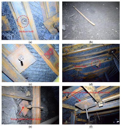 The maximum load capacities of the cable and rod bolt supports are 454 kN and 240 kN, respectively. They were installed in sections. Failure of a supporting structure can be classified into six main categories: bending of I-beams, ripping of steel strips, fracture of bolts and anchor cables, and loosening of bolts and anchor cables. Most broken bolts fail due to tension, as shown in Figure 6a,b. In the anchor cable, only one or two steel strands break instead of the entire strand, as shown in Figure 6c. Loose anchor bolts or cables often detach the tray from the roof or coal wall surface (Figure 6d,f), and some loose anchor cables are secured to the tray (Figure 6e). The most common cause of roof steel strip tearing is shear failure (Figure 6g). Bending failure of the I-beam support structure is often caused by significant ceiling sinking during roadway excavation (Figure 6h).