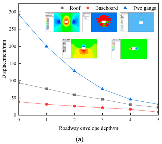 Based on the analysis of Figure 17a,b, we observed that regardless of the type of support system, the deformation of the surrounding rock gradually decreases as the roadway depth increases. However, the HSCTS support system showed a more uniform and symmetrical stress distribution in the roof and floor rock layers compared to the conventional support system. This suggests that the HSCTS support system has a significant impact on the stress distribution in the excavated roadway, resulting in symmetric and evenly distributed stress without concentration, which is beneficial for ensuring the stability of the surrounding rock.