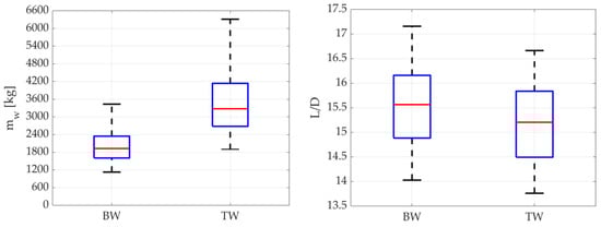 Statistical analysis of the structural mass of the lifting system (left) and of lift-to-drag ratio (right) for the BW and TW datasets [].