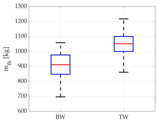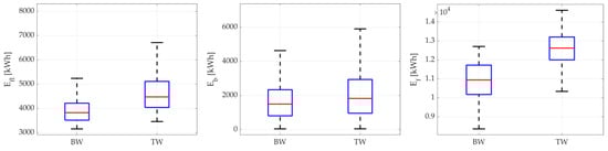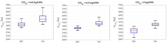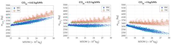 Figure 8 shows the total mass of emissions varying the parameter . The first outcome from these results is that, even if the block fuel reduces increasing MTOW, hence a part of the energy to accomplish the mission is provided by batteries, the increases for both BW and TW if the current production of electricity is taken into account; see the left part of Figure 8. The trend becomes neutral if we consider an increase in renewable sources (see the middle part of Figure 8), whereas sensible improvements in can be gained if the whole production of electricity is renewable-based (see the right part of Figure 8); in this case, the follows the trend of the block fuel. The second outcome provided by this analysis is that BWs configurations, in any scenario, produce less than the corresponding TW, for the same reasons presented in Section 1 when discussing the block fuel as FoM. The statistical analysis of the datasets of Figure 8 is shown in Figure 9.