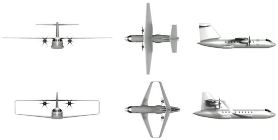 As anticipated in Section 1, this work extends and completes the one recently presented in [], so that the design and performance analysis methodologies are only briefly mentioned here for the sake of brevity. The interested reader may refer to [] and the other related authors’ references [,,] for a more in-depth examination of the methodological aspects. The design of the hybrid-electric aircraft, both in TW and BW configuration, was conducted using different conceptual design software, which was developed in house to deal with this specific scenario.