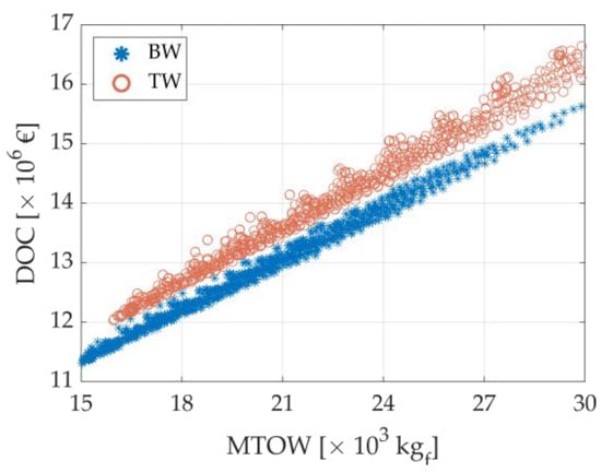 Regarding maintenance and capital investment costs, these are directly related to the operating empty weight (OEW) according to the models discussed in [,]. In particular, these reduce for lower values of OEW, hence providing DOC reductions in BW configurations. This aspect is highlighted in Equation (2), which shows that depends linearly on the weight of the airframe. A similar relationship exists for , but it has not been reported for sake of conciseness; the reader can refer to the appendix of [] for more details. The crew- and fee-related costs are identical, since the aircraft was designed for the same top-level aircraft requirements, thus requiring the same onboard crew and being subject to the same navigation and ground operation fees.