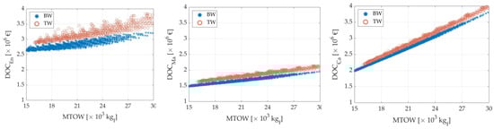 As in the case of the design point, the lower cost quota for BW is mainly attributable to the lower energy demand for flight, and thus, the lower cost share of electricity and fuel. The advantage for the BW over the TW decreases as the payload decreases, but above all, as the range decreases, i.e., as the energy required to perform the flight is reduced. As MTOW increases, a substantial increase in DOC is observed throughout the whole pax-range diagram for each configuration, again highlighting the trade-off that must be paid in economic terms if fuel consumption is to be reduced with hybrid-electric propulsive technologies. Nevertheless, this scenario remains wide open, as policy actions to tax pollutant and greenhouse emissions are currently under discussion [], and these could introduce economic penalties for the most fuel-consuming flights.