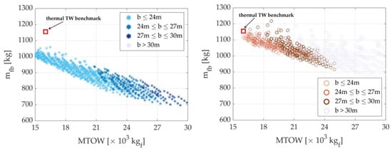 In Figure 7, the results of the sensitivity analysis are reported in terms of block fuel, for both the TW and BW configurations datasets. These results, taken from the first part of this research [], highlight that increasing MTOW is beneficial to achieve reduction in block fuel reductions.