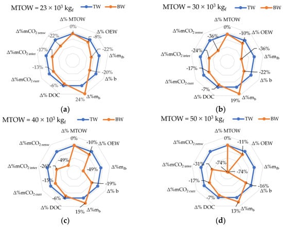 Radar charts of the FoMs comparison between the optimal BW–TW configurations. MTOW: (a) 23 × 103 kgf; (b) 30 × 103 kgf; (c) 40 × 103 kgf; (d) 50 × 103 kgf.