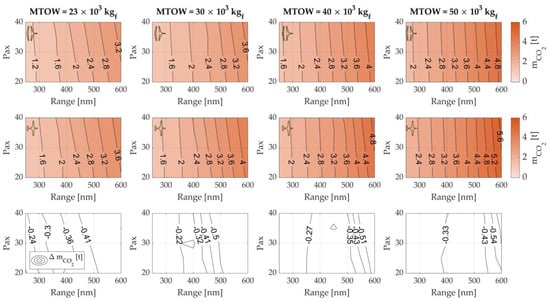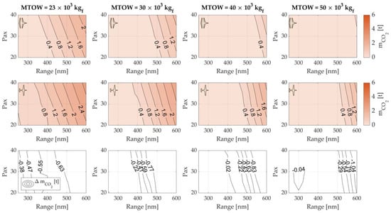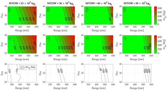 The single-point comparison considering the design point presented in Section 4.2 provides relevant indications in terms of performance differences between TW and BW. However, aircrafts most often operate far from the design point [], and for payload-range combinations, that may be variable. Therefore, in order to provide as general a discussion of aircraft performance as possible, it is appropriate to evaluate key FoMs within the entire payload-range envelope. In [], this was completed with regard to the block fuel analysis, as shown in Figure 11, which illustrates the fuel consumption contours for standard missions at varying passengers number (20 to 40) and range (250 to 600 nm) for the TW- and BW-optimized configurations; see Section 4.1. These charts show the substantial benefit related to the use of BW hybrid-electric aircraft, for each of the MTOW considered. If we consider MTOW values similar to those of the regional turboprop aircraft currently operating (e.g., up to 23t for the ATR 72) and analyze the differences between optimized BW and TW (see the bottom part of Figure 11), we obtain average block fuel savings up to 200 kgf; these gains for the BW increase as the MTOW is increased. This result highlights again the potential fuel saving of the BW configuration, which can be extended to the entire pax-range envelope. A further relevant result lies in the capability of the BW configuration with MTOW equal to 50 × 103 kgf to operate throughout the entire operational envelope with almost zero fuel consumption, except for the small quota required for take-off. As extensively discussed in [], the fuel consumption at the design point is 113 kg, with the highest amount in the cruise phase; if the range reduces, fuel consumption decreases, as well in climb and cruise phases, where no fuel is burnt at the exception of the take-off phase. The trade-off between MTOW and is a peculiarity of hybrid-electric configurations, which by carrying more batteries, thus increasing the MTOW, allow more electrical energy to be supplied during flight, at the expense of less energy demand for fuel.