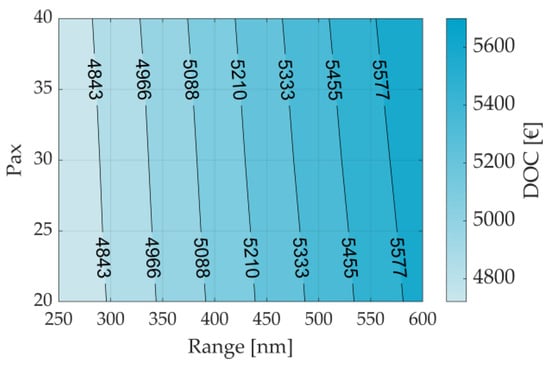 However, considering the current scenario, i.e., without taking possible emissions charges into account, and comparing the data of the thermal benchmark DOC shown in Figure 13 with those of the hybrid-electric BW and TW (see Figure 12), it can be observed that in all MTOW and pax-range conditions, there are economic disadvantages in operating hybrid-electric aircraft compared to the state of the art. The current strong investment in electric propulsion technologies for aviation applications, however, may indicate that in a future when these technologies are mature to be implemented, a reduction in related costs could be expected, thus mitigating the penalty in operating costs against current thermal aircraft.