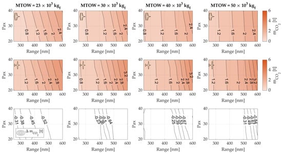 For the sake of completeness, the emission values within the pax-range diagrams for the optimized BW and TW configurations for the three previously discussed scenarios of , , and , respectively, are shown in Figure 14, Figure 15 and Figure 16. It is interesting to note that, in the case of , it is the range that is dominant in the emission trend, as this value is strongly related to both fuel and electricity and thus depends on the total energy budget required to fly. This trend is less pronounced in the case, and instead, the effect of the number of passengers becomes more apparent in the case. In general, BW exhibits substantial advantages over TW in all operating envelopes. The two main outcomes previously discussed in Section 4.2 can also be observed from these data: first, in the scenario, the opposite trend between general reductions in obtained as configurations with larger MTOW are considered (see Figure 11), resulting in increases in emissions; this trend becomes almost neutral in the scenario, while follows in the case.