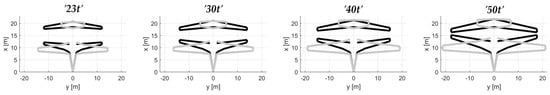 An overall summary of the comparison between the couples of optimal BW–TW configurations, for each value of the MTOW considered, is reported in Figure 10, which provides a complete overview of the results of the optimization process. In this context, the comparison is expressed in the form of radar charts showing the percentage differences between TW and BW of the following metrics: MTOW, OEW, block fuel, wingspan, battery mass, DOC, in the three scenarios, evaluated at the design point.