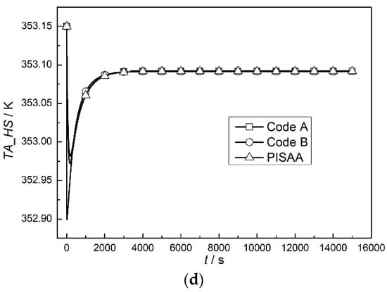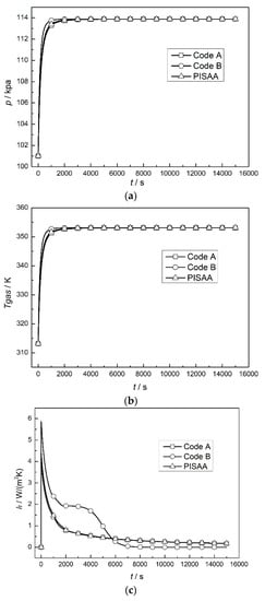 For the above case, calculations were carried out using traditional containment analysis codes, code A, code B and PISAA, respectively. The pressure and gas temperature in the control volume, as well as the wall temperature and heat transfer coefficient of the heat structure, were analyzed sequentially, and the comparison diagrams are shown in Figure 2 below.