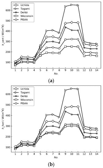 Effect of condensation model on heat transfer coefficient of condensation. (a) Vertical condensation wall. (b) Horizontal condensation wall.