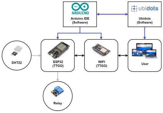 The TTGO development board is the main controller and communication system of the system because it contains various modules. It is responsible for reading the signals from the sensors to activate or deactivate the actuators, according to the rules defined by the user through the ESP32 module. Likewise, it is in charge of making the Internet connection through the Wi-Fi module, to send the data on temperature, humidity and status of the actuators, updating the information every 5 min in the cloud; the information is visible on the web through the platform ubidots on smartphones or computers. It is powered by a 3.7 to 4.2 VDC battery.