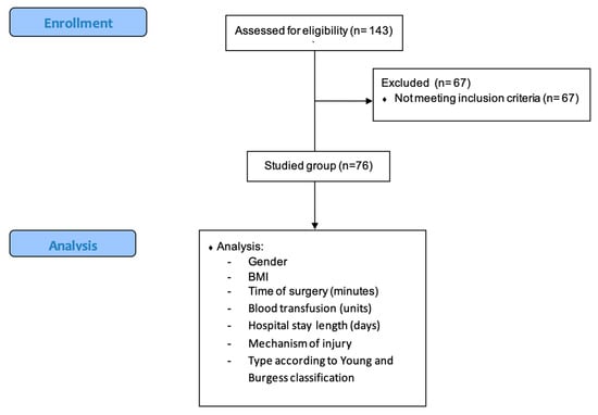 A total of 76 patients who underwent operative treatment for pelvic ring fractures between 2017 and 2022 met the inclusion criteria and were included in the study (Chart 1). The inclusion criteria required patients to have a pelvic fracture demanding surgery, either with or without concomitant injury.