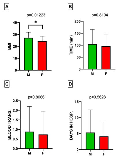 The studied cohort had a mean BMI of 26.4 (ranging from 17.8 to 44.8). The mean duration of surgery was 102.4 min, ranging from 35 to 270 min. The average number of blood transfusions received was 0.8 units, in a range of 0 to 5 units. The mean length of hospital stay was 4.9 days, ranging from 1 to 36 days. In total, 23 patients (%) were female and 53 patients (%) were male. Statistical analysis showed significant differences between male and female populations in terms of BMI (p = 0.01223), (Figure 1A) but none in duration of surgery (p = 0.8104), blood transfusion (p = 0.8066), and length of hospital stay (p = 0.5628) (Figure 1B–D).