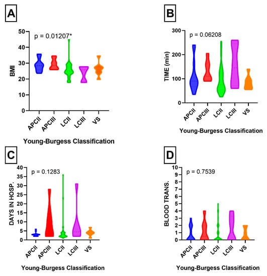 When analyzing the population according to the Young and Burgees classification (Table 1), statistically significant differences were observed in BMI (p = 0.01) distribution among the subgroups with certain types of fracture (Figure 2A). Patients with a higher BMI had more frequent APC II and APC III fractures. On the other hand, there were no significant differences in the time of surgery (p = 0.06), length of hospital stay (p = 0.12), or blood transfusion (p = 0.75) within certain subgroups (Figure 2B–D).