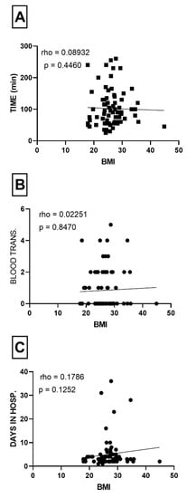 The Spearman’s rho correlation analysis between BMI and surgery duration (p = 0.44), blood transfusion (p = 0.84), and length of hospital stay (p = 0.12) did not reveal a statistically significant relationship (Figure 3A–C).