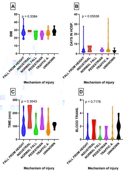 Classification based on the mechanism of injury did not reveal any statistically significant differences when analyzing BMI (p = 0.33), length of hospital stay (p = 0.055), surgery duration (p = 0.30), and blood transfusion (p = 0.71) (Figure 4A–D).