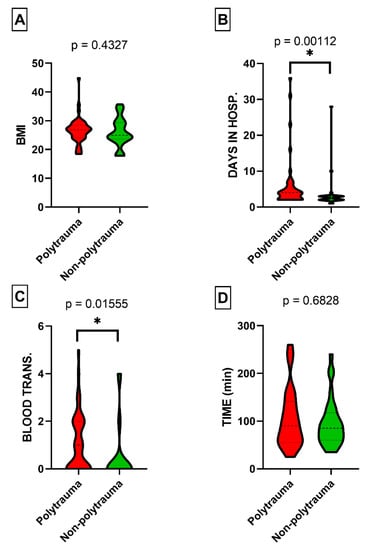 (A) Comparison of BMI in pelvic fractures with or without polytrauma. (B) Comparison of length of hospital stay in pelvic fractures with or without polytrauma. (C) Comparison of blood transfusion in pelvic fractures with or without polytrauma. (D) Comparison of surgery duration in pelvic fractures with or without polytrauma. * p-value < 0.005.