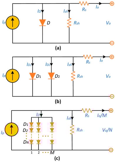 For demonstrating the real-time characteristics of PV systems, their mathematical modeling is required under practical considerations. A PV array can be modeled by using the cell as its basic unit. SDMs are widely used due to their simplicity and ease of implementation. According to Figure 1a, the equivalent circuit for the SDM consists of a parallel resistor, a series resistor, a diode, and a current source. Calculating the output current can be accomplished using the following formula []: