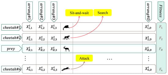 Based on these strategies, as shown in Figure 2, cheetah populations are formed in different arrangements. The probable hunting arrangements of each cheetah are considered equivalent to the solution to the problem. It is assumed that the best position among the population determines the prey (best solution). Cheetahs adjust their possible arrangements to optimize their performance during the hunting period.