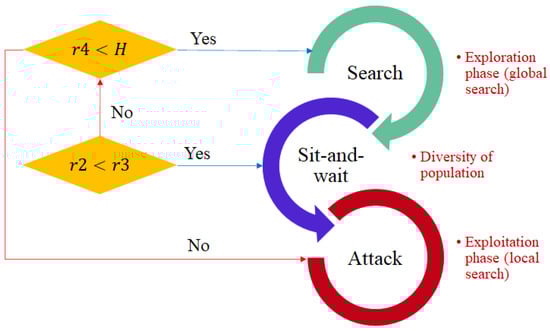 Choosing the right strategy in the CO algorithm is performed randomly []. Let and be two random numbers from a uniform distribution. If is greater than , then the sit-and-wait strategy is selected; otherwise, one of the search or attack strategies takes place. There is a condition between the two strategies of search and attack, which is controlled based on the H factor (see Figure 3). This factor decreases over time, which is expressed as follows []: