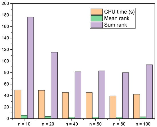 One of the parameters influencing the performance of any evolutionary algorithm is the size of the initial population. Therefore, the behavior of the proposed algorithm for optimal extraction of the parameters of the three PV models was investigated with population sizes (n) of 10, 20, 40, 50, 80, and 100. For each of these population sizes, the ICO was run 30 times, and the statistical results are summarized in Table 3. As can be seen, for the SD and PVM models, the algorithm could achieve the best solution (Min value) for all population sizes. For the DD model, the algorithm reached the best solution in 9.824849 × 10−4 with n = 80. In addition, the proposed algorithm showed significant robustness with all initial populations, except for the population of 10. The CPU times and Friedman test results through 30 runs are represented in the last three columns of Table 3, and their average values for the three models are shown in Figure 4. Based on these results, it can be seen that the proposed algorithm with n = 80 had the best relative performance in the three models, with an average sum rank of 80 and a CPU time of 39.5 s. The population sizes of 40 and 50 ranked second and third among all examined population sizes, respectively.