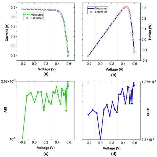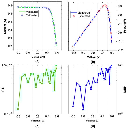 Current flows through the first and second diodes (i.e., and , respectively) as described by the Shockley diode equations in Equations (7) and (8). Diodes also have two ideality factors known as and . The diffusion and saturation currents are and , respectively. Thus, by substituting Equations (3), (7), and (8), Equation (6) can be rewritten as follows: