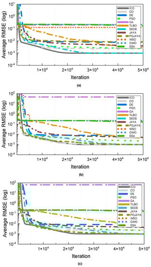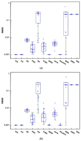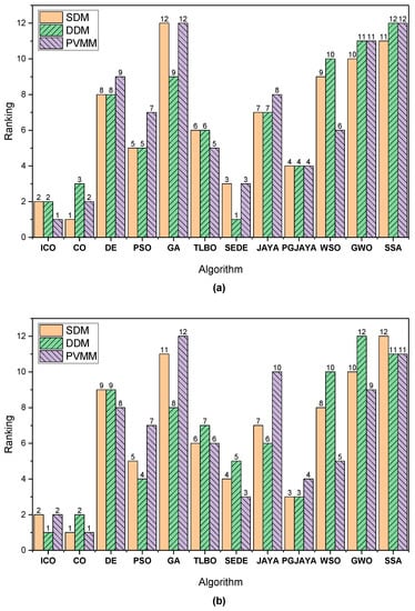 Moreover, two recently developed algorithms, PGJAYA [] and SEDE [], as well as eight well-known original algorithms (i.e., DE [], PSO [], GA [], TLBO [], JAYA [], SSA [], WSO [], and GWO []) were chosen to validate and verify the effectiveness of the CO and ICO for identifying the PV parameters. A maximum number of 50,000 function evaluations was assumed for all case studies. As in the original literature, the other parameters of the applied algorithms were maintained. The statistical analysis was performed by running each algorithm 30 times independently in MATLAB 2021b.