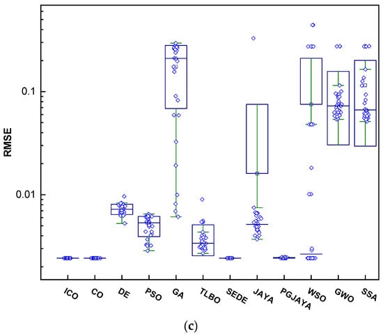 In Figure 12, each algorithm’s convergence curve is depicted for each model and indicates the average RMSE performance across 30 independent runs. As can be seen from Figure 12, it is evident that the ICO achieved a competitive or faster convergence rate than the other algorithms for the three PV models, demonstrating its capability to maintain a good balance between exploration and exploitation. It is worth noting that the convergence behavior of the CO seems better than that of the other conventional algorithms, such as DE, GA, PSO, WGO, SSA, TLBO, JAYA, and WSO.