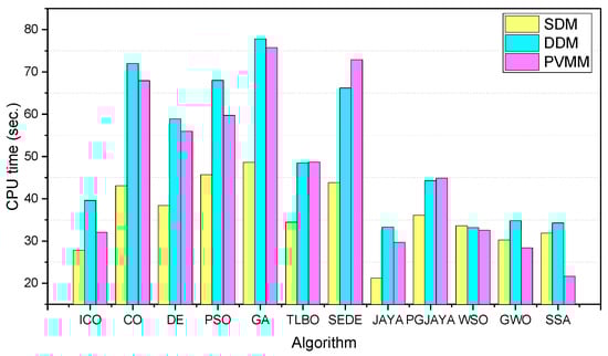 CPU time over 30 runs by different algorithms with n = 40 for SDM, DDM, and PVMM.