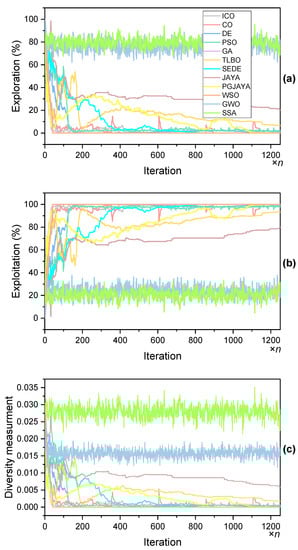 Figure 13a,b also shows that the ICO, CO, DE, PSO, GA, TLBO, SEDE, JAYA, PGJAYA, and WSO were all explorative at first, but after a few iterations, they were deemed exploitative algorithms. Similar results can be observed for the diversity measure in these algorithms which, after a few iterations, dropped (see Figure 13c). It must be noted, however, that spikes in the population diversity characteristic were observed in the CO due to the leave-the-prey-and-go-back-home strategy.