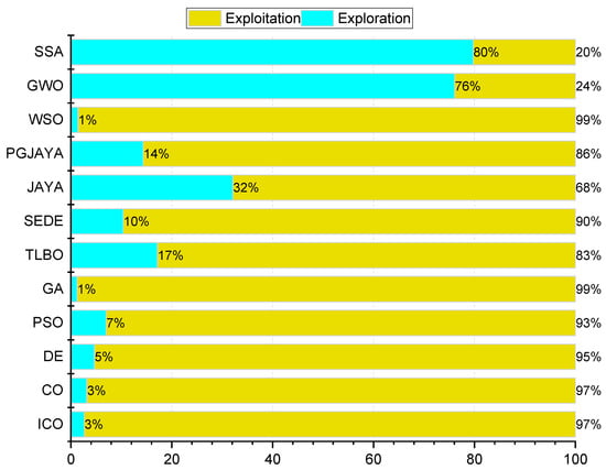 Figure 13a,b shows that, in contrast to the other algorithms, SSA and GWO exhibited a greater percentage of exploration during the iterations than exploitation. It is shown in Figure 14 that these two algorithms had average exploration-exploitation ratios of 80%:20% and 76%:24%, respectively. This was due to the high diversity in the population in these two algorithms, as shown in Figure 13c. Comparatively, the GAs and WSO provided the greatest level of exploitation capabilities, with an average value of 99%. Further evidence of this can be found in Figure 13c, demonstrating that these two algorithms were unable to provide sufficient diversity throughout the iteration process. Thus, premature convergence is one of the main weaknesses of these algorithms.