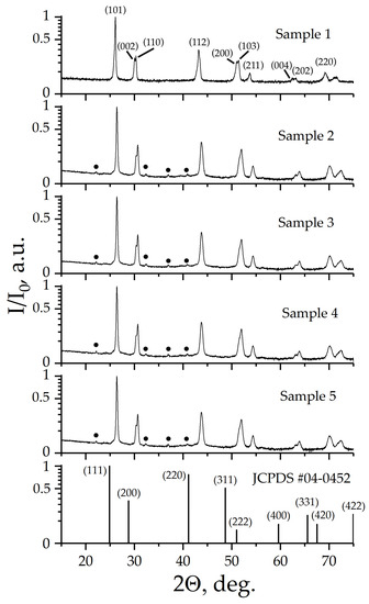 The following supporting information can be downloaded at: https://www.mdpi.com/article/10.3390/app13189999/s1, Figure S1: histogram of particle size distribution; Table S1: weights of initial reagents; Table S2: XRD data of Sample 1; Table S3: XRD data of Sample 2; Table S4: XRD data of Sample 3; Table S5: XRD data of Sample 4; Table S6: XRD data of Sample 5.