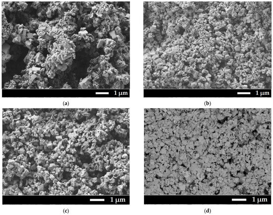 All powders have submicron sizes with a bimodal particle size distribution. The first maximum is about 200 nm, and the second is about 700 nm. Histograms of particle size distribution can be found in Supplementary Materials, Figure S1. Detection of backscattered electrons showed that the particles in Sample 3 are homogeneous in composition, there is no contrast in microphotographs. It has to be mentioned that corrosion of the glazed porcelain crucible and additional phases in SEM microphotographs were not observed. The presence of aluminum or silicon as the main elements of the crucible was not detected in EDX analysis. Buchinskaya et al. [33] also showed that there is no interaction between the sodium nitrate melt and the porcelain glazed crucible.