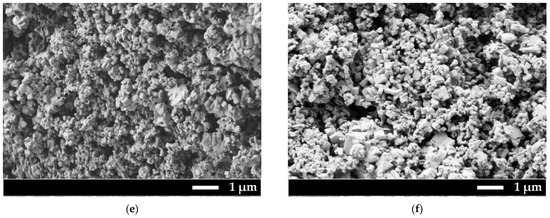 SEM microphotography of prepared samples. (a) Sample 1; (b) Sample 2; (c) Sample 3; (d) Sample 3 (detector of backscattered electrons was used for elemental contrast); (e) Sample 4; (f) Sample 5.