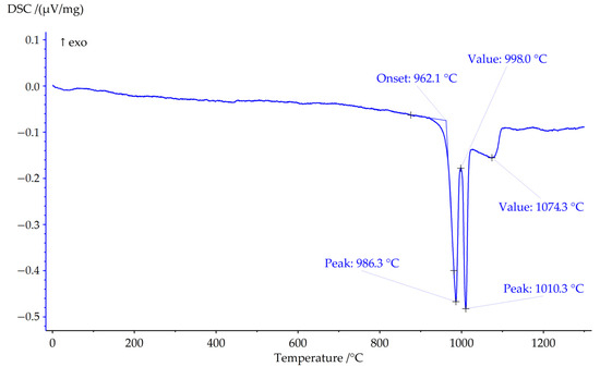 DSC analysis of Sample 3 in argon atmosphere was made up to 1300 °C (Figure 3). Peaks with maximums at 986 °C and 1010 °C correspond to phase reactions, and the effect with a maximum at 1074 °C corresponds to the end of melting of the sample (liquidus point). DSC data show that Sample 3 is stable in the flow of argon until 962.5 °C.