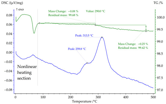 Thermal stability in air also was investigated (Figure 4). Sample 3 starts to lose weight at approximately 290 °C. The endothermal peak around 80 °C may be attributed to dehydration of adsorbed water. There are two exothermal peaks that could be attributed to the chemical reaction of pyrohydrolysis [34]. However, the X-ray pattern of Sample 3 did not change after this DSC experiment.
