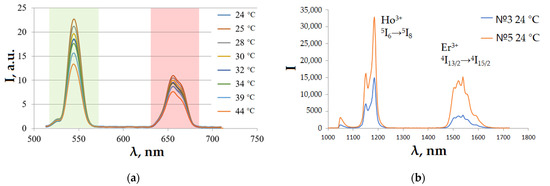 The temperature dependences of the ratio of the intensities of the red and green luminescence bands for the visible range of the spectrum are shown in Figure 6a, and the intensity ratios of the erbium and holmium luminescence bands for the SWIR range are shown in Figure 6b.