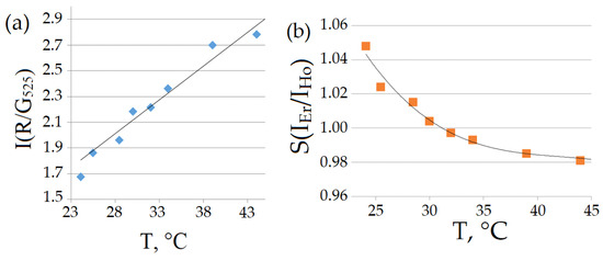 From the dependences presented in Figure 6, the relative coefficients of temperature sensitivity in the temperature range from 24 to 44 °C are determined: Sr = 5.55%×K−1 in the visible range and Sr = 0.34%×K−1 in the SWIR range.