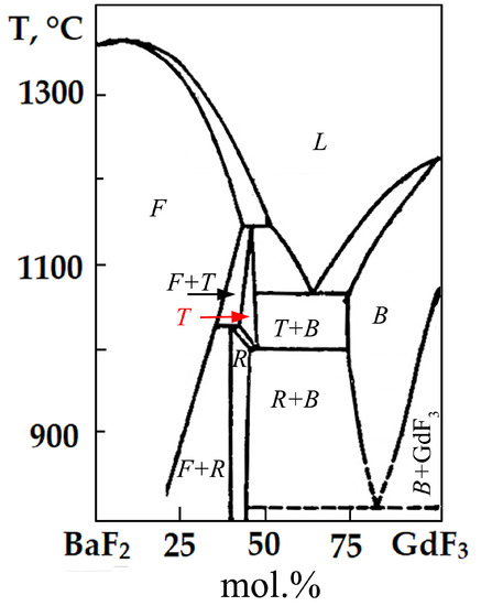Phase diagram of BaF2-GdF3 system. Phase designations: F—fluorite-type solid solution Ba1−xGdxF2+x; B—tysonite-type solid solution Gd1−yBayF3−y; R—trigonal fluorite-derivated phase on the base of Ba4Gd3F17 compound; T—tetragonal fluorite-derivated phase; L—liquid.