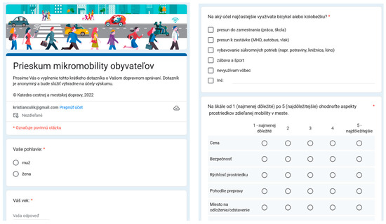 This sociological traffic survey was intended to be as reliable as possible, and therefore relied not only on online responses, but also on physical interactions. When in physical contact with the respondents, the interviewers asked the questions out loud, so it was basically a guided interview. The electronic questionnaire, prepared in Google Forms (Figure 2), was distributed to the respondents using email and other communication channels.