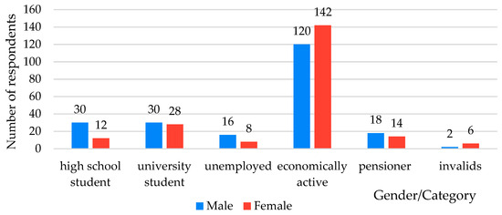 While conducting the survey, the interviewers addressed respondents over 15 years old. It follows that the respondents’ portfolio included high school students (9.9%) as the youngest people. Among adults, there were disabled pensioners (1.9%), unemployed residents (5.6%), pensioners (7.5%), and university students (13.6%) in the survey. Almost 62% of the respondents were economically active (employed). Figure 4 shows detailed results in absolute numbers.