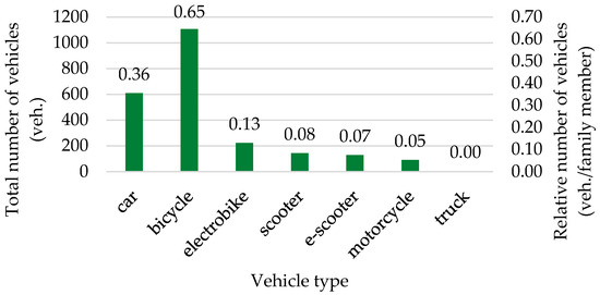 This sociological traffic survey aimed to find out information about the mobility of individuals. It did not deal with exact property relations. Therefore, as part of the next question, we focused on the number of members in the respondent’s household and the number of vehicles available to that household. All the respondents were part of households consisting of from 1 to 7 members. The average number of members in one home was 3.47. The examined homes were most equipped with bicycles without their own propulsion. On average, there were 0.65 bicycles and 0.36 vehicles per one household member. The typical means of transport were also electric bicycles (0.13), scooters (0.08), electric scooters (0.07), and motorcycles (0.05). N1 category trucks (vans) were rarely found in households. A graphic overview of the answers is in Figure 5.