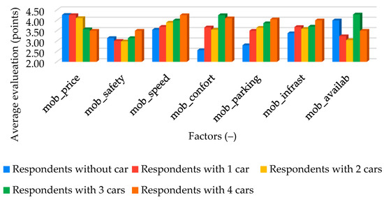 Moreover, we examined the influence of households’ car ownership on the assessment of individual factors. It was assumed that if a household did not have a personal car, it was because of the high costs associated with owning a personal car, or there may have been other reasons. The costs of owning a car can vary depending on various factors, such as the type of vehicle, its age, location, insurance rates, maintenance needs, and individual driving habits. Here are some typical costs associated with owning a car: