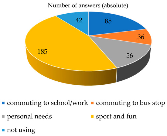 In our survey, the respondents could state that they used bicycles for several purposes. Therefore, the percentage expressions in the following lines do not add up to 100%. Only 36 respondents (8.45%) used a bicycle or scooter to get to public transport, a bus, or a train stop. Shared scooters and bikes enhance public transport accessibility in many Slovak cities. For example, Žilina offers classic shared bicycles but also electric scooters. Slovakia has only one city that also provides shared electric bicycles.