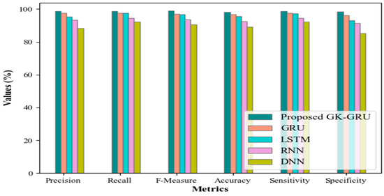 This phase validates the proposed technique’s performance. The performance of the proposed GK-GRU and prevailing GRU, long short-term memory (LSTM), recurrent neural network (RNN), and deep neural network (DNN) is elucidated in Figure 4. The proposed GK-GRU achieved remarkable results with a precision of 98.85%, recall of 98.64%, F-measure of 98.95%, accuracy of 98.15%, sensitivity of 98.65%, and specificity of 98.46%, while the other remaining classifiers obtained approximate rates of precision, recall, F-measure, accuracy, sensitivity, and specificity of 93%, 95%, 94%, 93%, 95%, and 91%, respectively. Figure 4 suggests that the GK-GRU model exhibits superior performance to existing models due to its capacity to optimize the learning process, leading to enhanced overall performance.